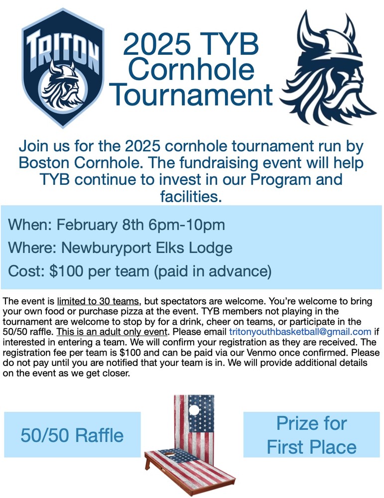 On February 8th, TYB will be hosting a cornhole tournament at the Newburyport Elks Lodge at 6pm. Space is limited to 30 teams on a first come, first served basis. TYB members not playing in the tournament are welcome to stop by for a drink, cheer on teams, or participate in the 50/50 raffle (we will do a presale of tickets as we get closer). This is an adult only event. Please email tritonyouthbasketball@gmail.com if interested in entering a team. We will confirm your registration as they are received. The registration fee per team is $100 and can be paid via our Venmo once confirmed. Please do not pay until you are notified that your team is in.