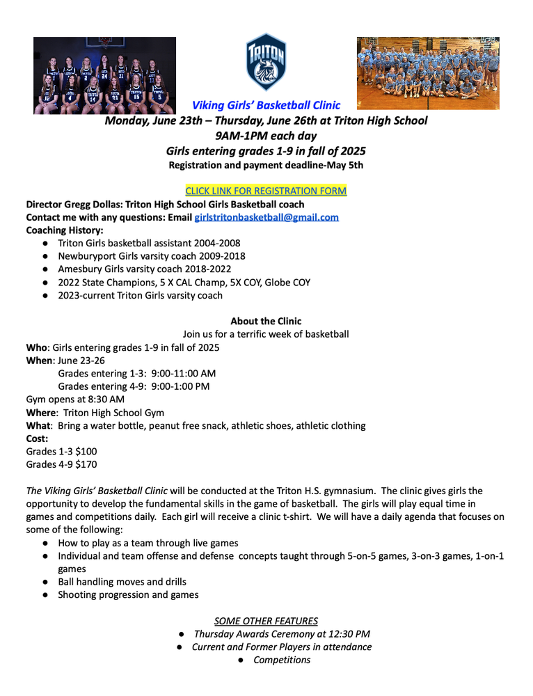Triton Girl's Varsity Coach Gregg Dollas will be holding a summer basketball clinic:
